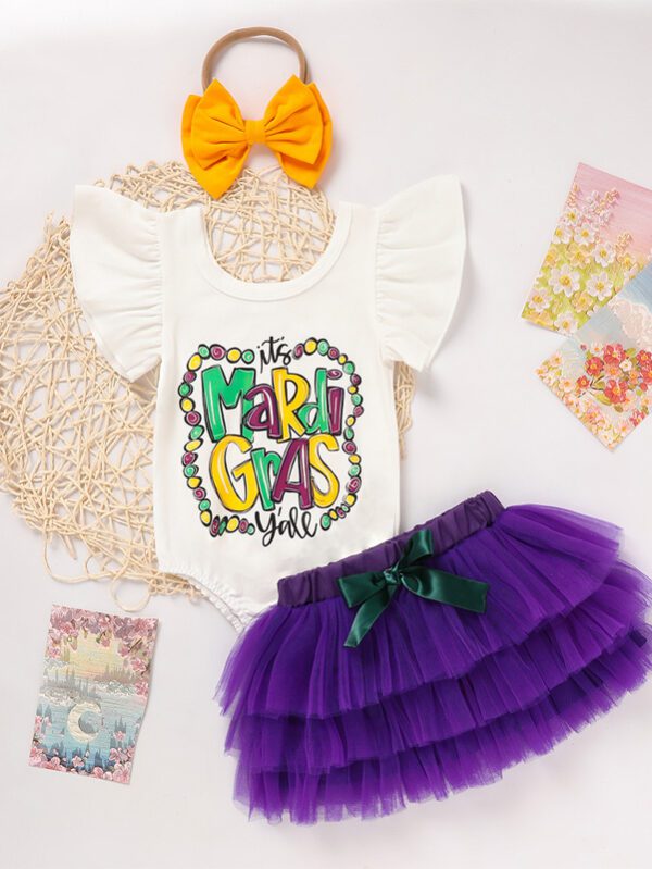 Baby Girl 2-Piece Set – Letter Print Onesie with Elastic Waist Tulle Skirt & Bow – Party & Photoshoot Outfit