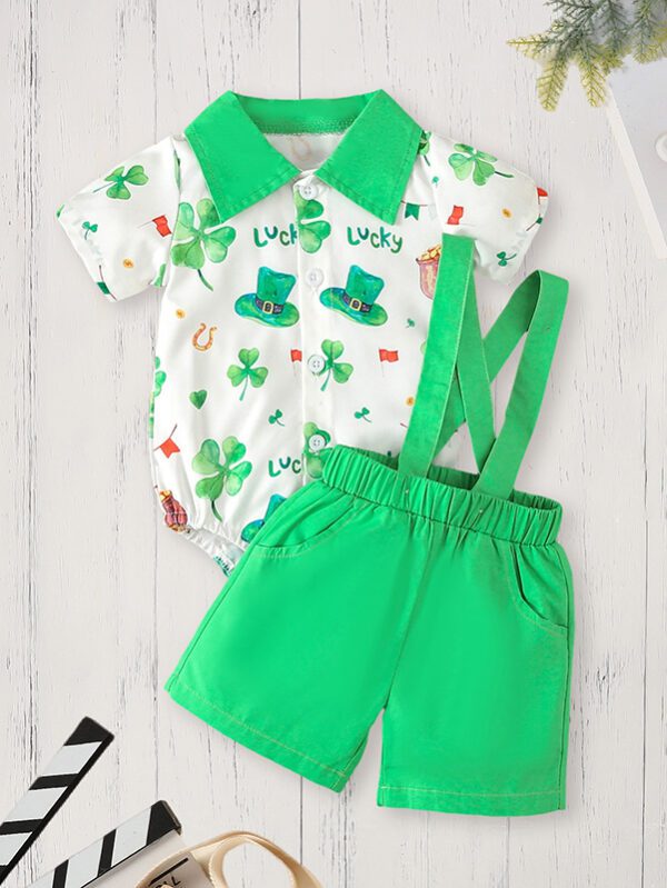 Baby Boy St. Patrick’s Day Outfit – Clover Print Romper & Suspenders Pants 2-Piece Set (3–24M)