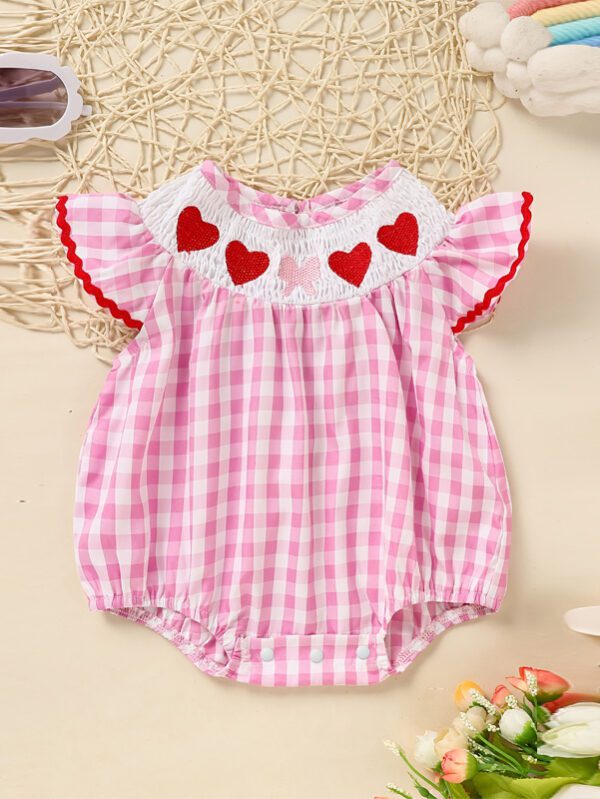 Baby Girl Checkered Romper – Short Sleeve with Heart Embroidery, Ruffle Trim & Back Cut-Out (0–18M)
