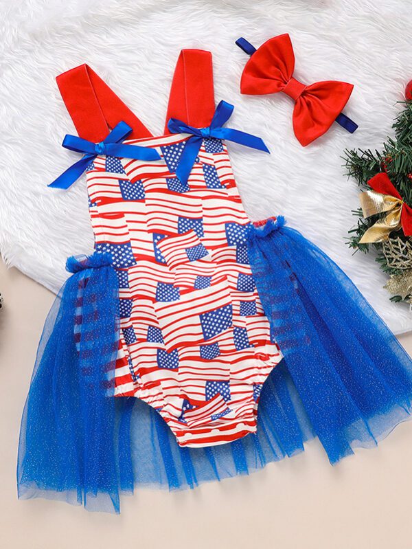Baby Girl 4th of July Romper – Sleeveless Flag Print Triangle Bodysuit with Bowknot (0–12M)