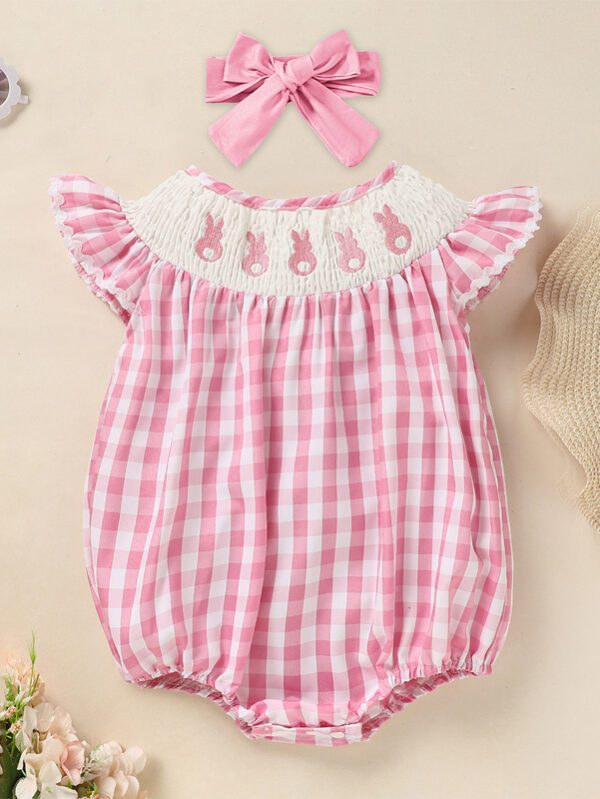 Baby Girl Bunny Romper Set – Cap Sleeve Pink Checkered Playsuit with Headband for Easter (3–18M)