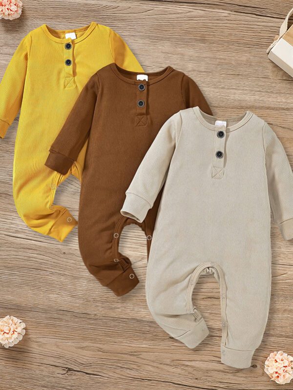 3-Pack Newborn Baby Ribbed Rompers – Long Sleeve Button Front Jumpsuits for Boys & Girls (0–24M)
