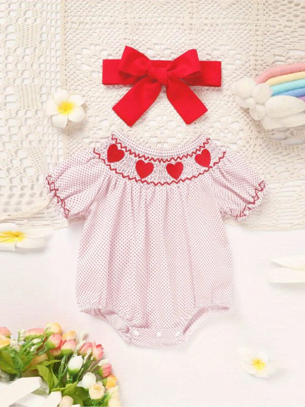 Baby Girl Pink Romper – Polka Dot with Heart Embroidery & Ruffle Trim for Valentine’s Day (0–18M)