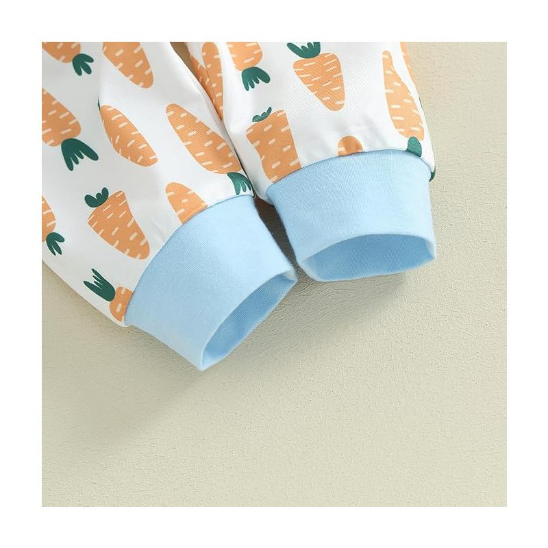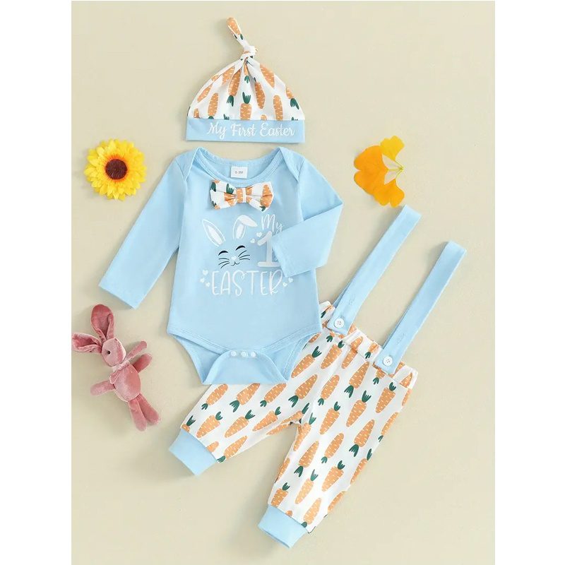 This charming set includes a long sleeve rabbit print romper, carrot-print suspender pants, and a matching hat — creating the perfect coordinated look for holidays, photos, and special occasions.